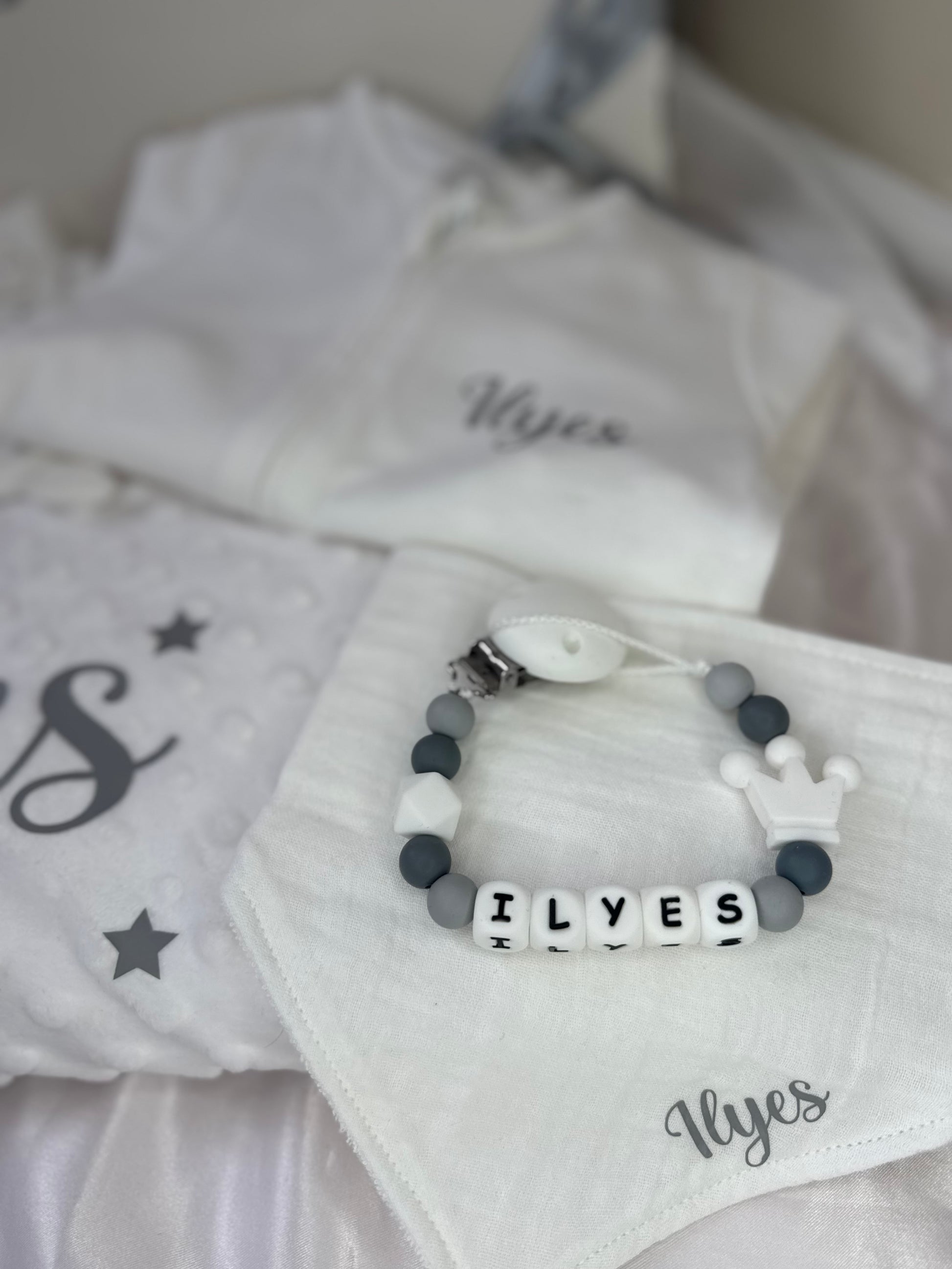 NB : La couleur de l'attache tétine sera assortie à la couleur d'écriture choisie, afin de garantir une belle harmonie dans le coffret.